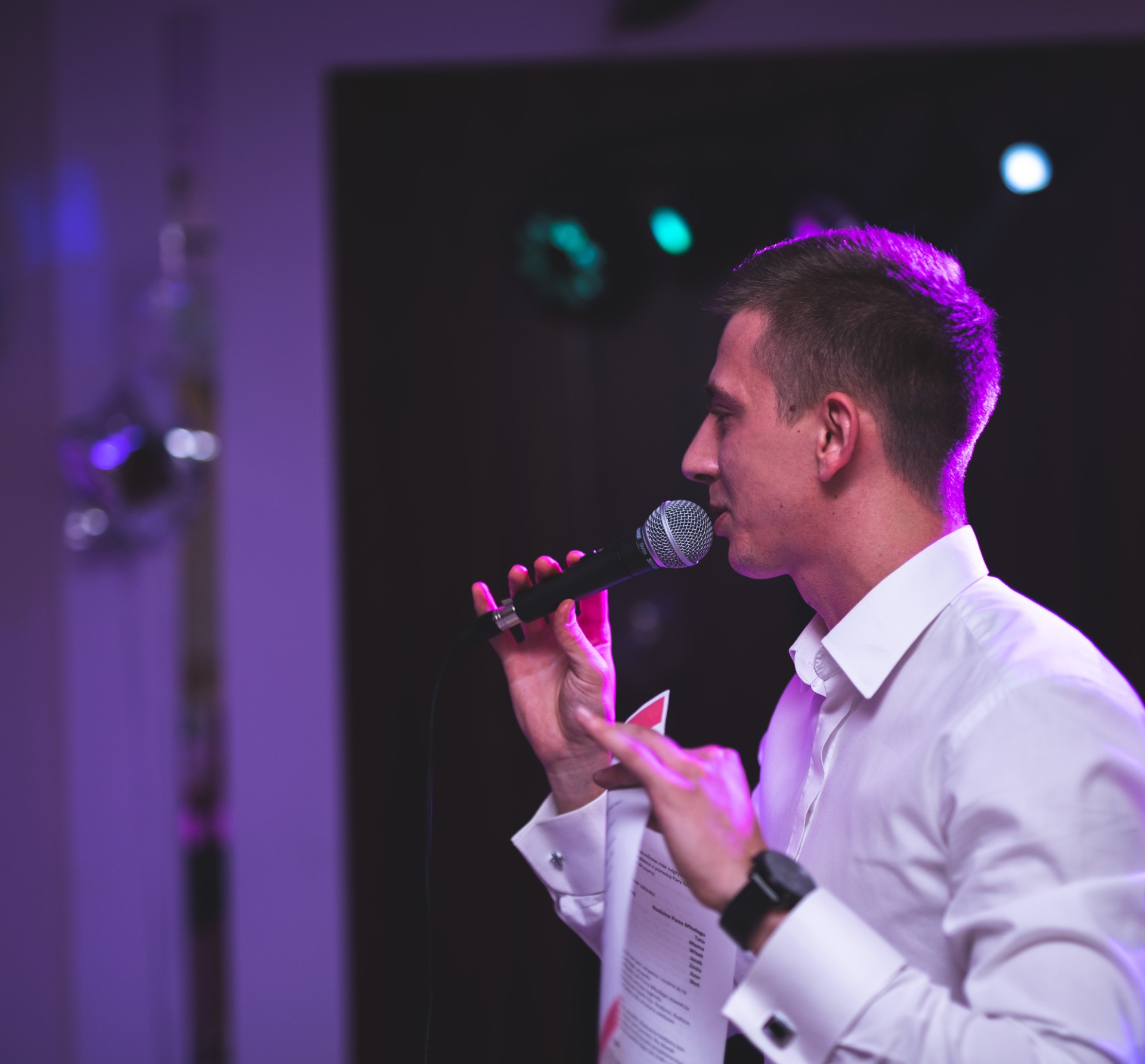 Nie boję się wyjść na parkiet i przemawiać do gości. W końcu każde przyjęcie zasługuje na eleganckie powitanie i subtelny wstęp. Osobiście wygłaszam toasty, informuję o przebiegu imprezy i zapowiadam atrakcję. Mikrofon nie jest mi straszny – wiem, jak ważny jest dobry kontakt z gośćmi.